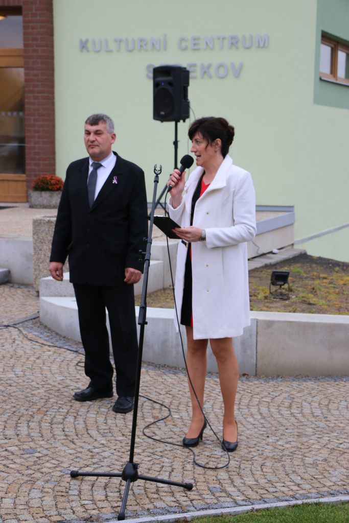 Ve čtvrt na pět sál utichl při zaznění první tónů české hymny, po které následoval projev starostky. Ta ve své řeči vyzdvihla význam vzniku samostatné Československé republiky i základní principy fungování státu tak, jak je zformuloval Masaryk. Shrnula i základní milníky při rozvoji obce za posledních 100 let a na závěr vyjádřila přání, aby rozvoj obce pokračoval i nadále.