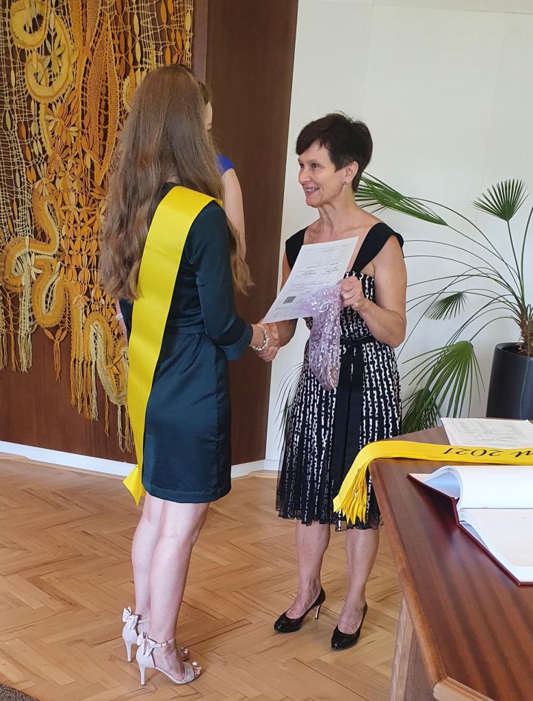 Šerpování absolventů se ujala ředitelka školy Mgr. Jitka Nováková, vysvědčení a malou upomínku na školní léta předala třídní učitelka Mgr. Iveta Kašparová.