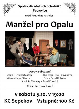 Komedii Johna Patricka Manžel pro Opalu hraje Spolek divadelních ochotníků Petrovice. Obsazení: Eva Bartošová jako Opala Kronkieová Pavel Kdolský jako Kapitán Mooney Ivana Talaváňová jako Růženka Montefalcová Hanka Šťastná jako Vilma Lemonová Pavel Kubíček jako Otis Lemon