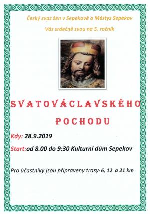 Český svaz žen v Sepekově a Městys Sepekov srdečně zvou na 4. ročník Svatováclavského pochodu, který se bude konat v sobotu 29.9.2018. Start: od 8:00 do 9:30 restaurace Obecní dům v Sepekově. Pro účastníky jsou připraveny trasy: 6,12 a 21 km.