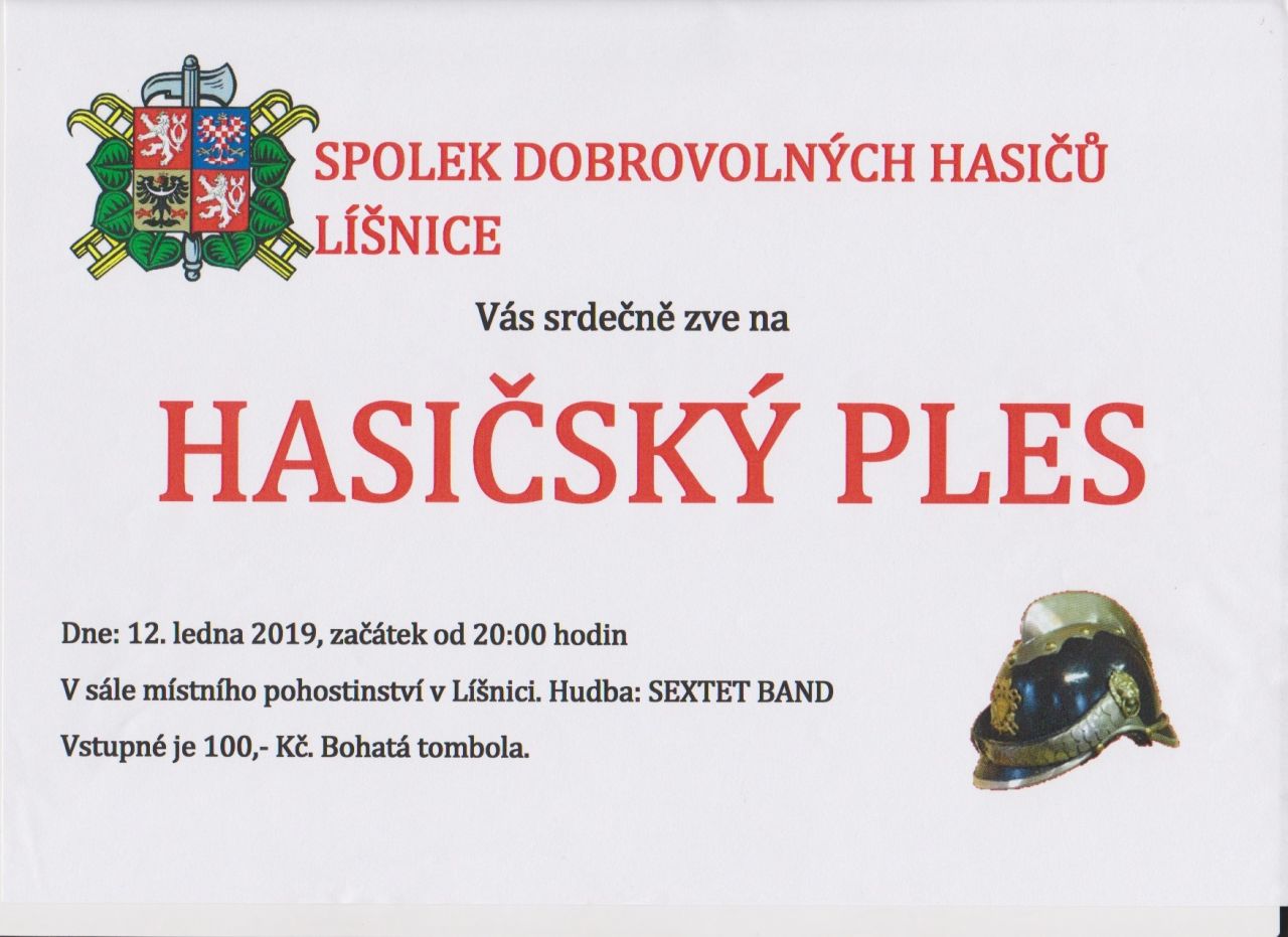Sbor dobrovolných hasičů Líšnice srdečně zve v sobotu 12. ledna 2019 od 20 hodin do sálu pohostinství v Líšnici na HASIČSKÝ PLES. Vstupné 100,- Kč. Bohatá tombola.