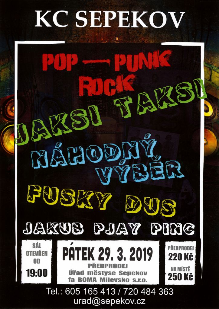 Ještě před OUTSIDER TOUR 2019 si pražská pop-punková hudební kapela Jaksi Taksi udělá zastávku v Kulturním centru Sepekov! Společně s ní dále vystoupí Náhodný Výběr ze Soběslavi a Fusky Dus z Milevska a Hrejkovic.