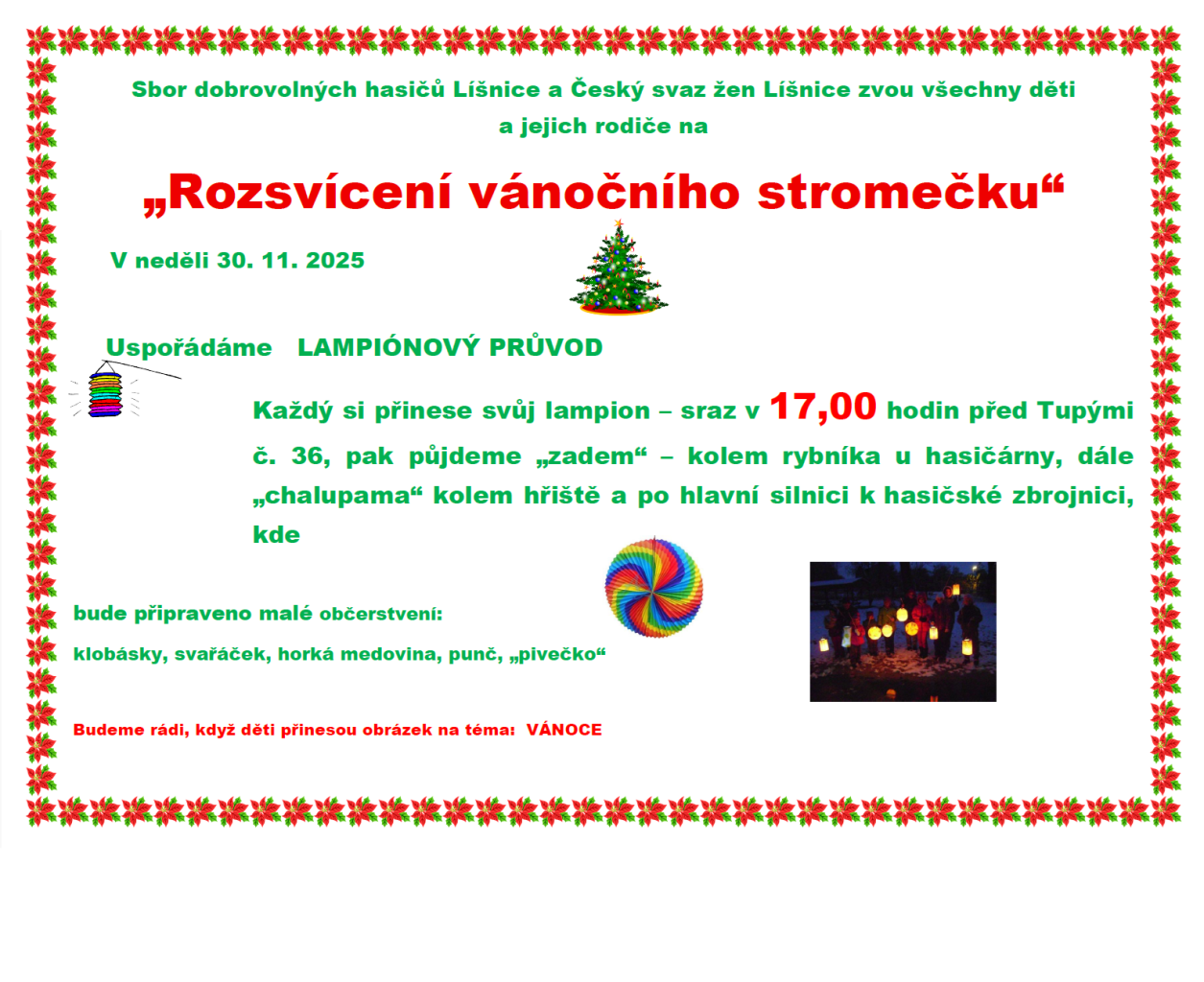 Sbor dobrovolných hasičů Líšnice a Český svaz žen Líšnice pořádají v neděli 30. listopadu tradiční rozsvícení vánočního stromečku v Líšnici.