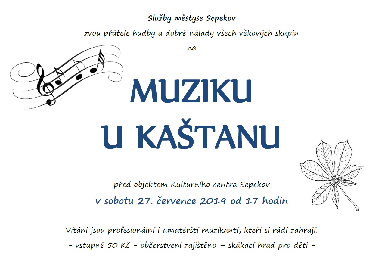 Zveme všechny příznivce muziky a dobré nálady do Sepekova na Muziku u kaštanu, která se bude konat v sobotu 27. července 201 od 17 hodin na nově revitalizovaném prostoru před objektem Kulturního centra Sepekov. Rádi uvítáme všechny profesionální i amatérské muzikanty. Pro děti bude připravený skákací hrad.
