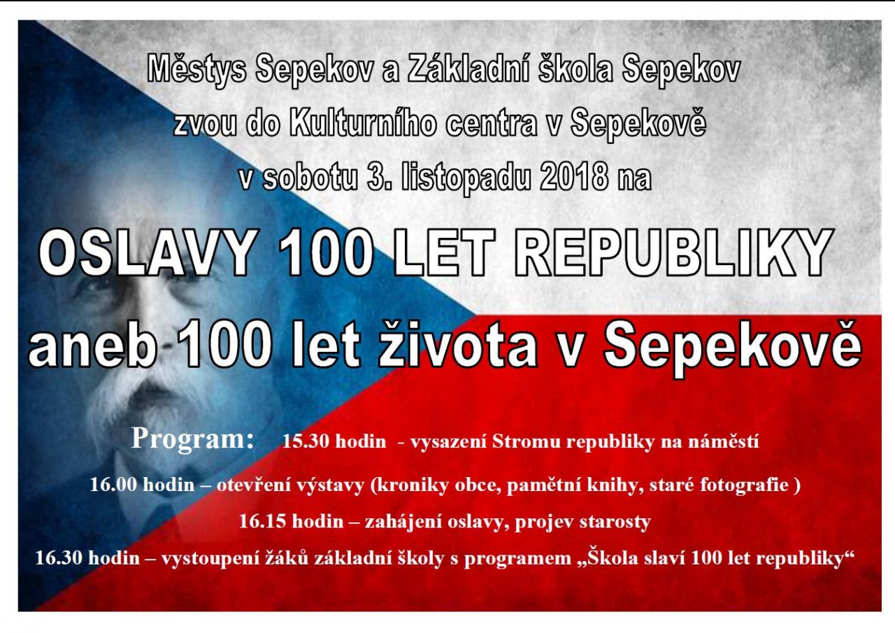 Městys Sepekov a Základní škola Sepekov zvou na oslavu 100. výročí vzniku Československé republiky aneb 100 let života v Sepekově, které se uskuteční v sobotu 3. listopadu 2018 v v Kulturním centru Sepekov.