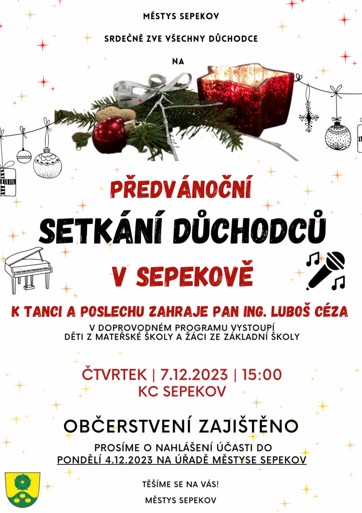 Z důvodu příprav pohoštění, prosíme o nahlášení účasti do PONDĚLÍ 4. 12. 2023 na Úřadě městyse Sepekov.