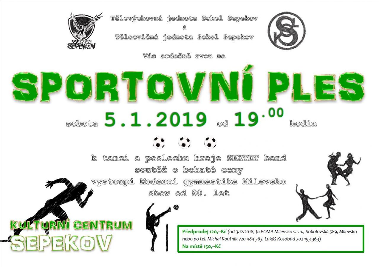 Tělovýchovná jednota Sokol Sepekov a Tělocvičná jednota Sokol Sepekov srdečně zvou na SPORTOVNÍ PLES v sobotu 5.1.2019 od 19.00 hodin v sále kulturního centra Sepekov.