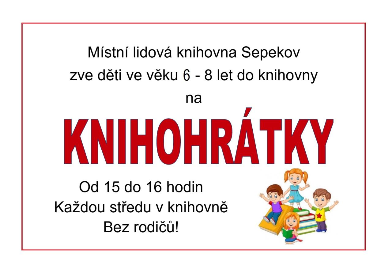 Knihovna Sepekov zve děti ve věku 6 až 8 let do knihovny na "KNIHOHRÁTKY", každou středu v čase od 15 do 16 hodin.