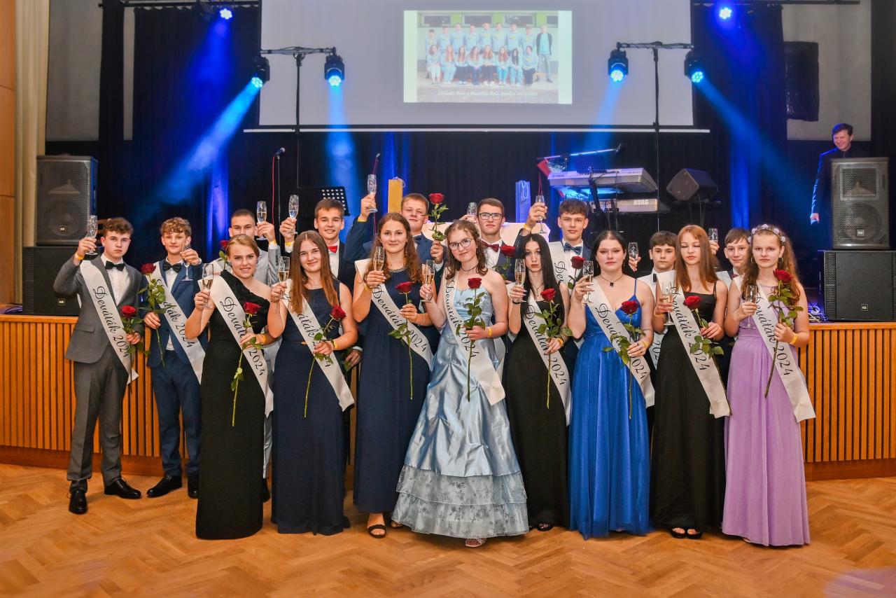Program celého večera byl velmi pestrý. Všechny přítomné zaujalo dynamické vystoupení taneční skupiny EFK, které předcházelo jednomu z hlavních bodů večera, společnému tanci dívek a chlapců 8. a 9. třídy, slavnostní polonéze. Vznešený tanec navodil důstojnou atmosféru, a tak byl ten správný čas na šerpování žáků 9. třídy. Všichni byli moderátorem postupně představeni a poté jim byla předána šerpa absolventa školy. Po krátkých proslovech ředitelky školy, starosty obce, třídního učitele a žákyň 9. třídy mohl následovat slavnostní přípitek (samozřejmě nealko).