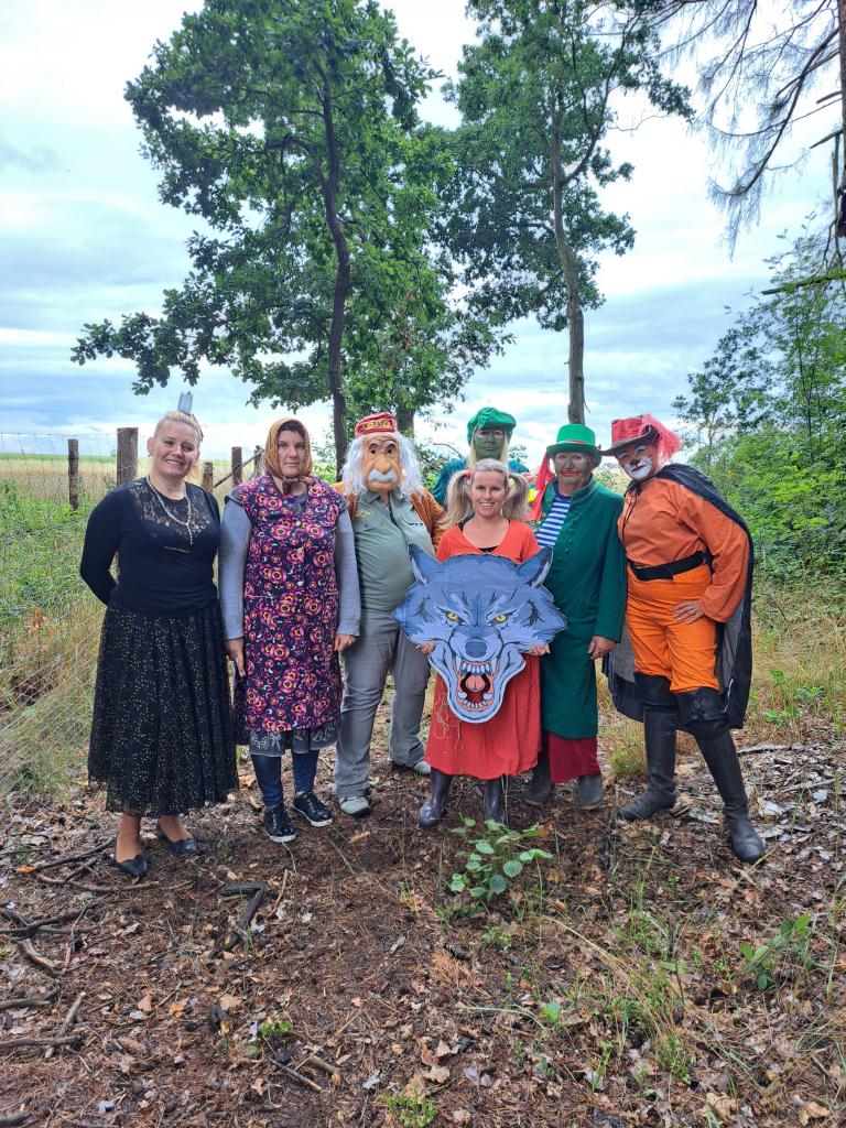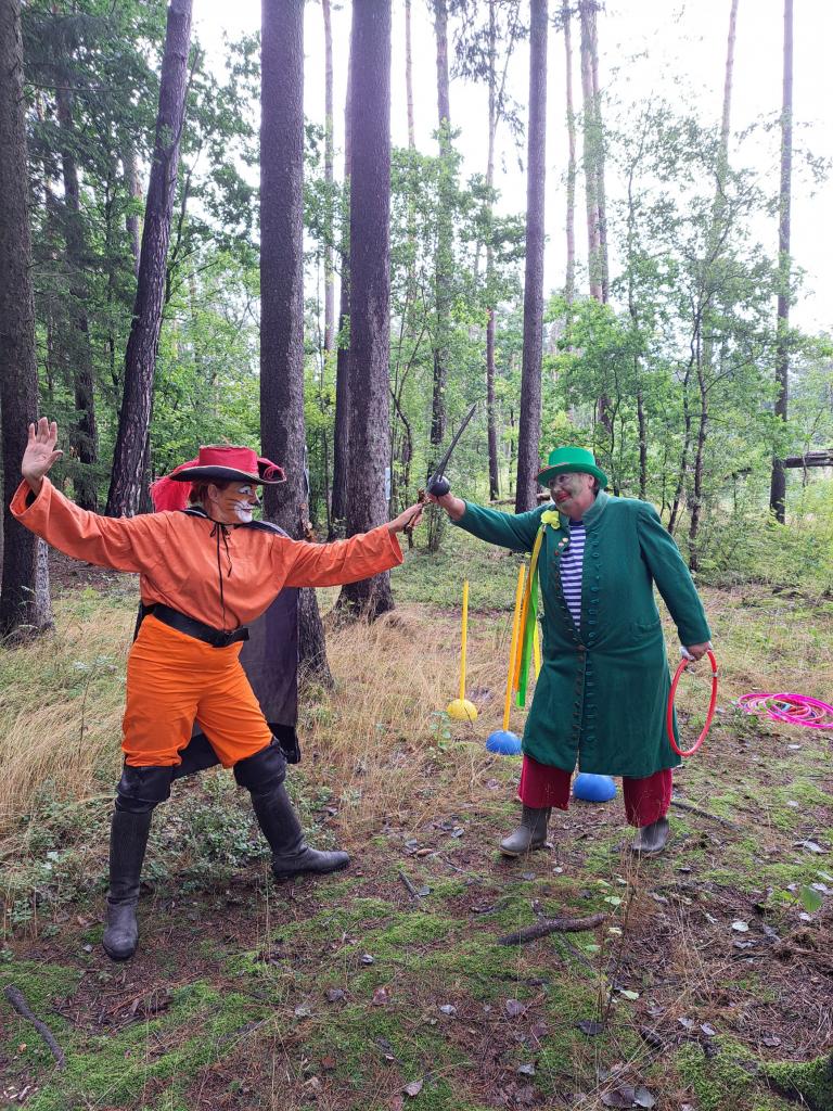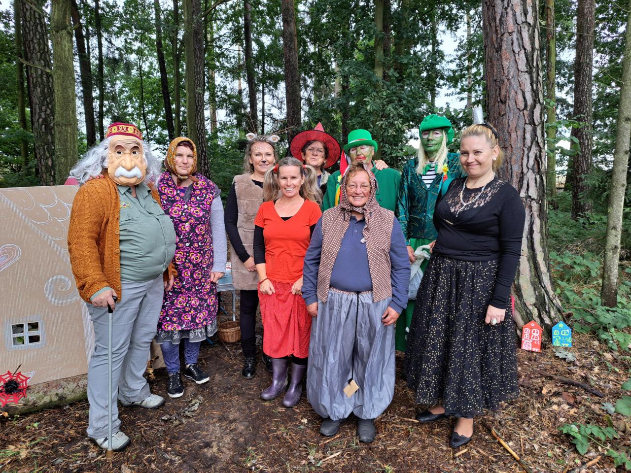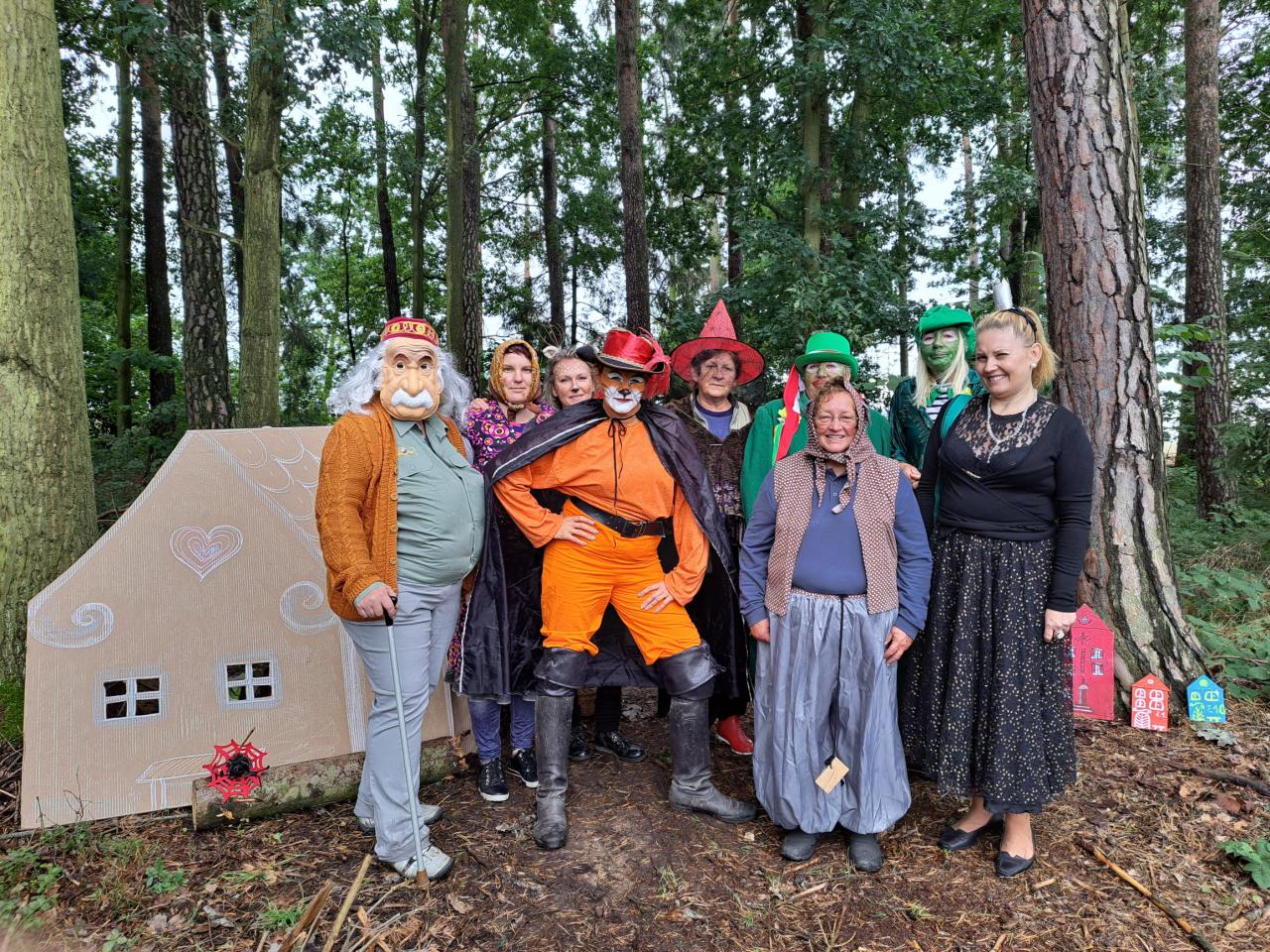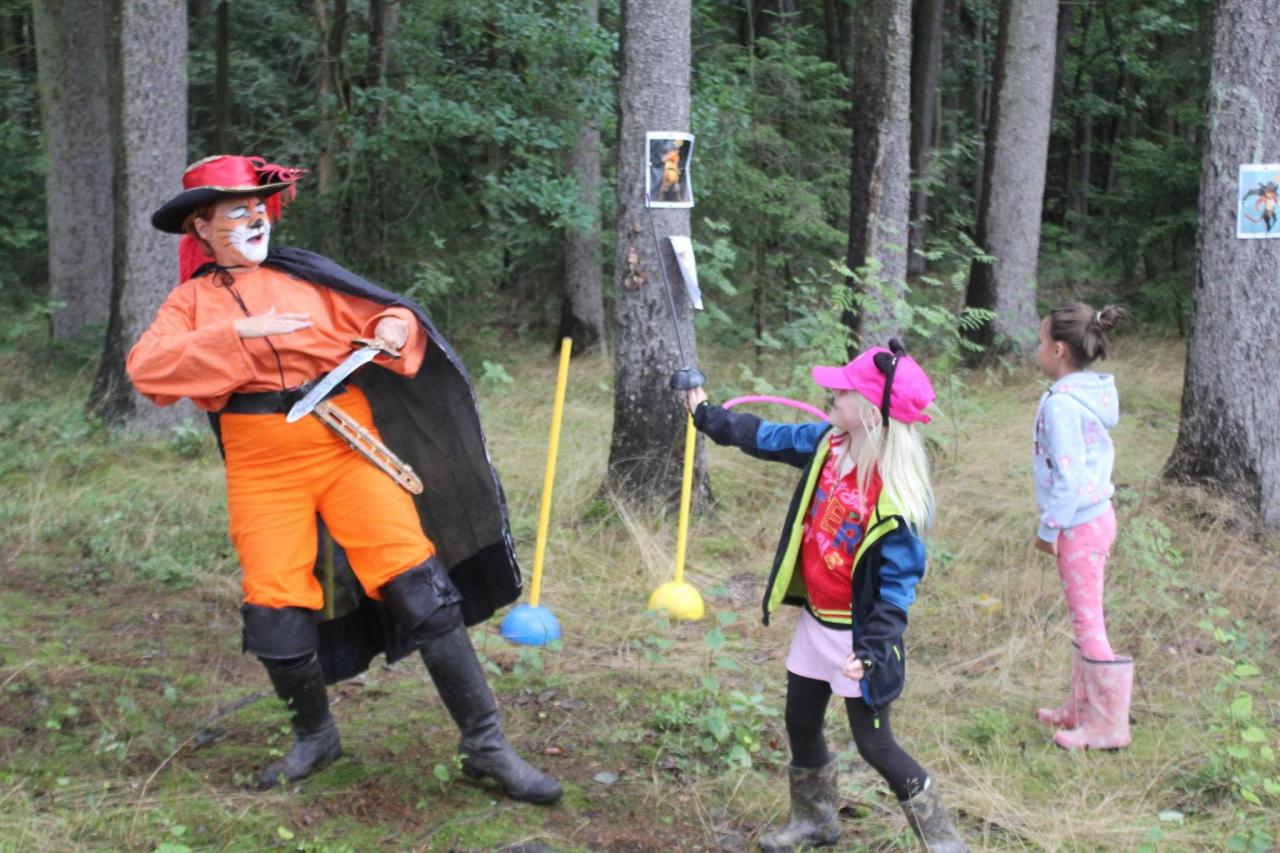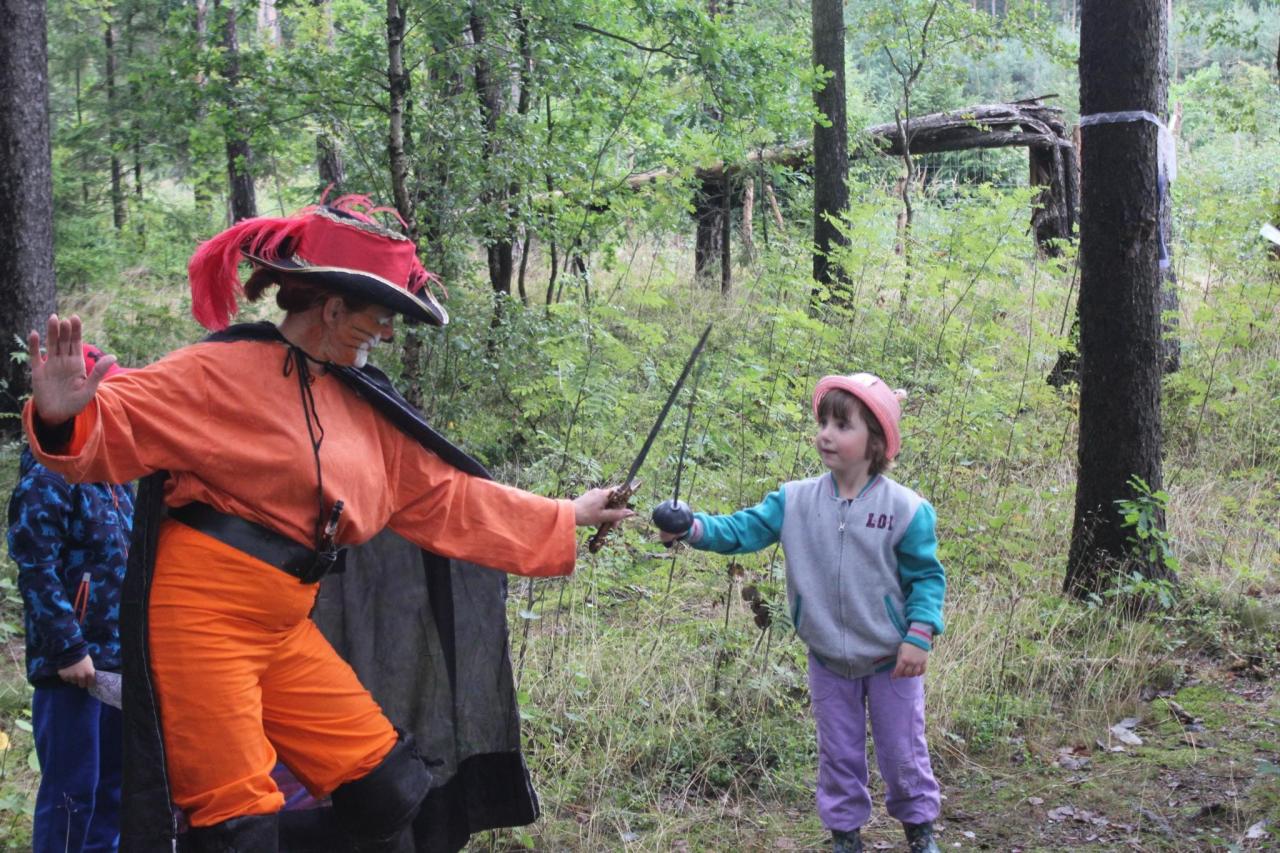 Cestou lesem se děti mohly setkat se zákeřným kocourem v botách, s kterým si musely dát šermířský souboj, se zvídavou čarodějnicí, s roztomilým srnečkem, Karkulkou s rozzuřeným vlkem, krásnou princeznou, malou myškou, s vodníky u kterých si zkoušely vylovit dušičky a s dědkem a babkou v komických rolích u perníkové chalupy…tady děti musely postavit vhodný domeček pro bydlení.