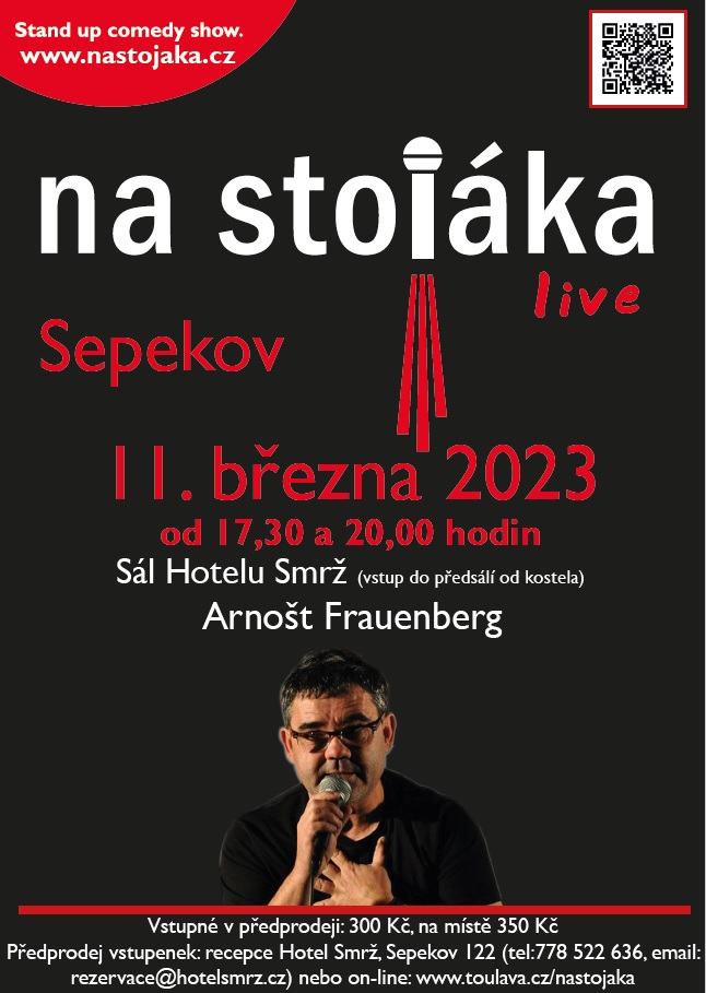 Hotel Smrž zve v sobotu 11. března od 17.30 a od 20.00 hodin na zábavnou stand up comedy show NA STOJÁKA live s Arnoštem Frauenbergem. Místo konání: Hotel Smrž v Sepekově (vstup do předsálí od kostela) Vstupné: předprodej 300 Kč, na místě 350 Kč Předprodej: recepce Hotel Smrž, mob. 778 522 63